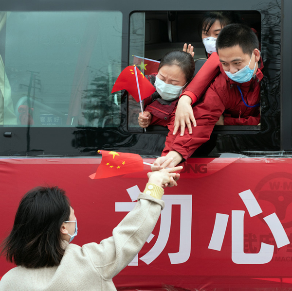 3月22日,湖南省对口支援湖北省黄冈市红安县医疗队队员凯旋返程。(张发喜/人民图片)