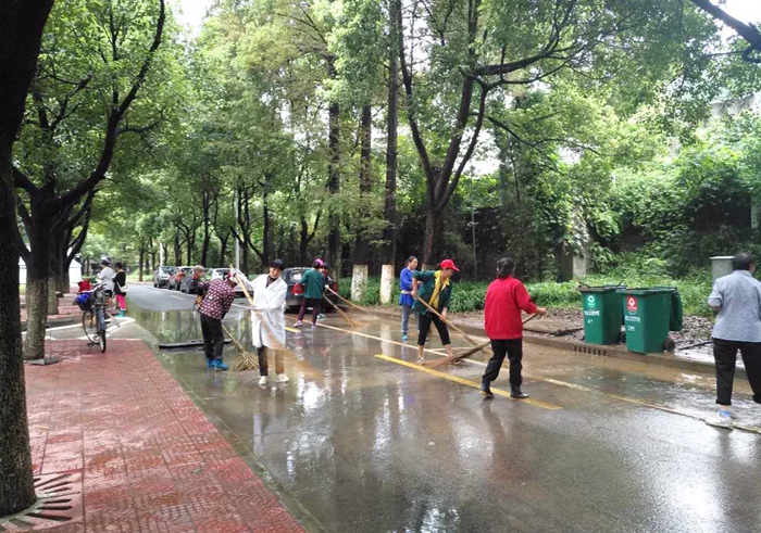 随后, 后勤处安排人员准备排涝清淤工具,在易滑坡地点实时监控,校医院积极做好防控,做好消毒清理工作,防止次生灾害发生。后勤集团、保卫处、资产经营公司的应急分队对校园各路段路面的积水进行清扫,对泥渣土进行了铲除,最后对路面进行了冲洗。在N6教学楼周围,由于地势较低,积水较多,排水不畅,后勤集团应急分队立马布线架设抽水泵,加快排水进度,待水情稳定后,后勤集团、保卫处、资产经营公司应急分队的队员就近打开消防栓,紧急架设消防水带,利用消防水枪全面冲洗路面,同时进行人工清淤和积水清扫。经过近10个小时的辛苦劳动,截止下午五时,校园内的积水全部排除、淤泥全部清理、路面全部洗净,校园内恢复了干净整洁的面貌。