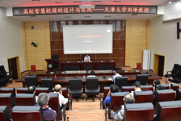 (新区建设办公室 教工通讯员 王双琦)6月22日下午,天津大学信息与网络中心主任刘峰教授,受邀莅临学校,在图书馆一楼多功能报告厅做了主题为“高校智慧校园的设计与实践”的学术报告。报告会由副校长魏跃春主持,学校领导,新校区建设工作领导小组成员单位,各职能部门,数计学院师生代表参加了此次报告会。