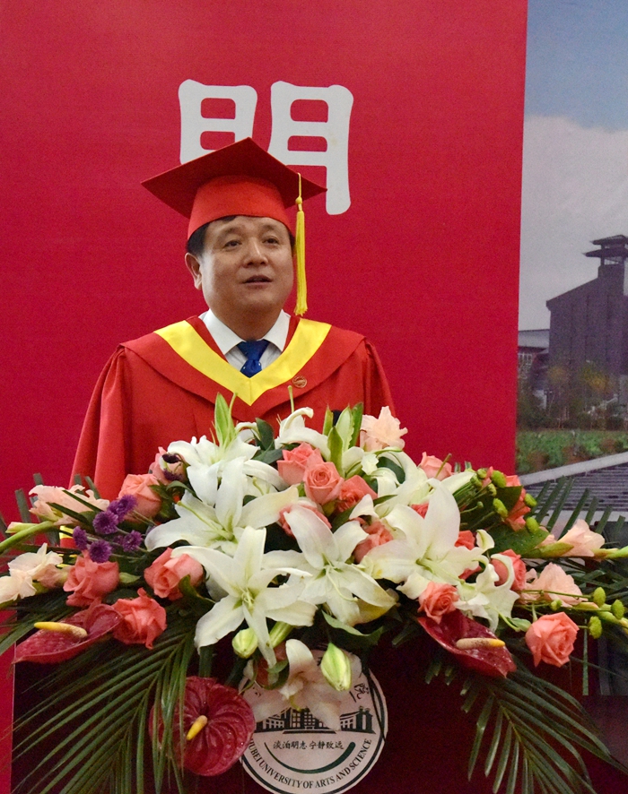 一是以德明志,志存高远,做一个坚守理想的人。隆中学子始终要秉承“淡泊明志,宁静致远”的校训精神,心怀志向,坚守理想,更要追寻大道,肩负大义,以青年大学毕业生应有的道德素质为根基,担当作为,努力撑起国家的未来、民族的期望。特别是在你的逐梦之旅面临困难、遭到挫折的时候,更要不忘本心,恪守底线,挺住脊梁。我相信,只要大家保持久久为功的韧劲,理想最终会引领我们轻舞飞扬!