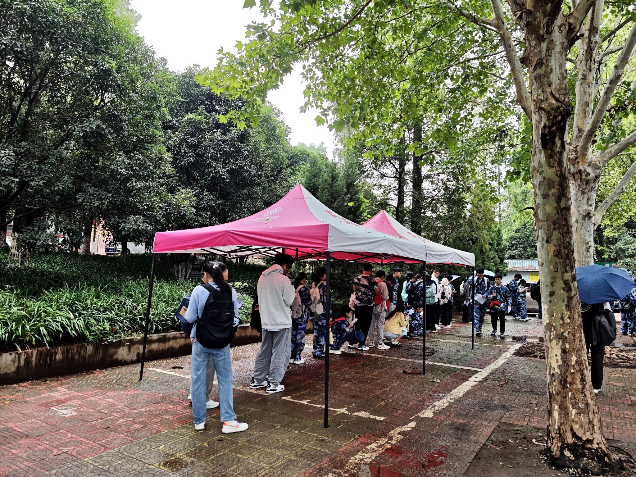 体检期间持续降雨,校医院及时启动应急预案,联合校园物业在低洼积水处放置防洪沙袋、疏通下水道,并在主要通道搭建防雨棚、设置室内等候区,确保新生在雨天也能安全、舒适地完成所有体检项目。
